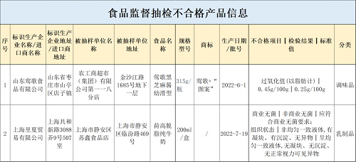 上海市市場監管局介紹,近期食品安全抽檢信息涉及9大類食品,包括:茶葉及相關制品,調味品,蜂產品,乳制品,食糖,蔬菜制品,水果制品,肉制品,食用油、油脂及其制品等。抽檢樣品共計1501批次,其中合格1499批次、不合格2批次。